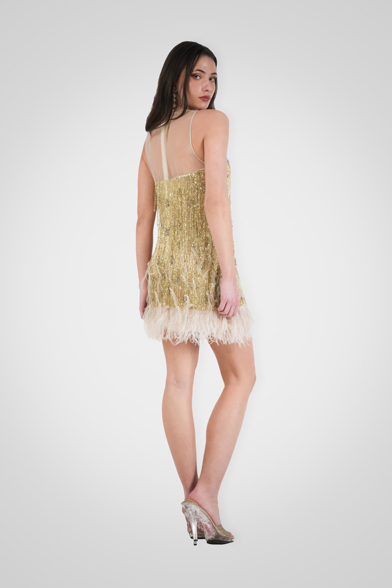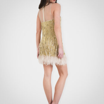Our exquisite Anther dress, crafted in champagne tulle adorned with exquisite line embroidery in bugle beads and sequins. Delicate ostrich feathers gracefully accentuate the hemline, adding a touch of luxury.