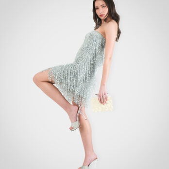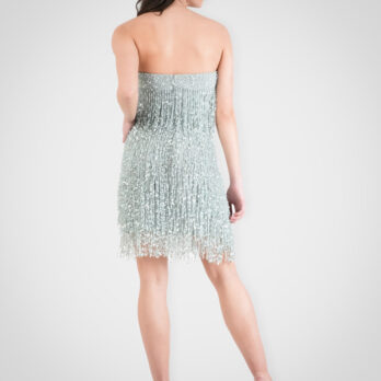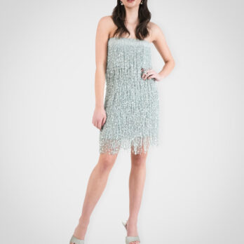 Our Azure Dress, a graceful powder blue ensemble designed for comfort with its mid-thigh fit and sleek tube neckline. This captivating piece is adorned with handcrafted fringes made from silver-threaded sequins and glass beads, adding an exquisite touch of elegance and charm.