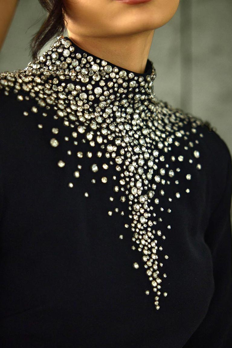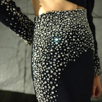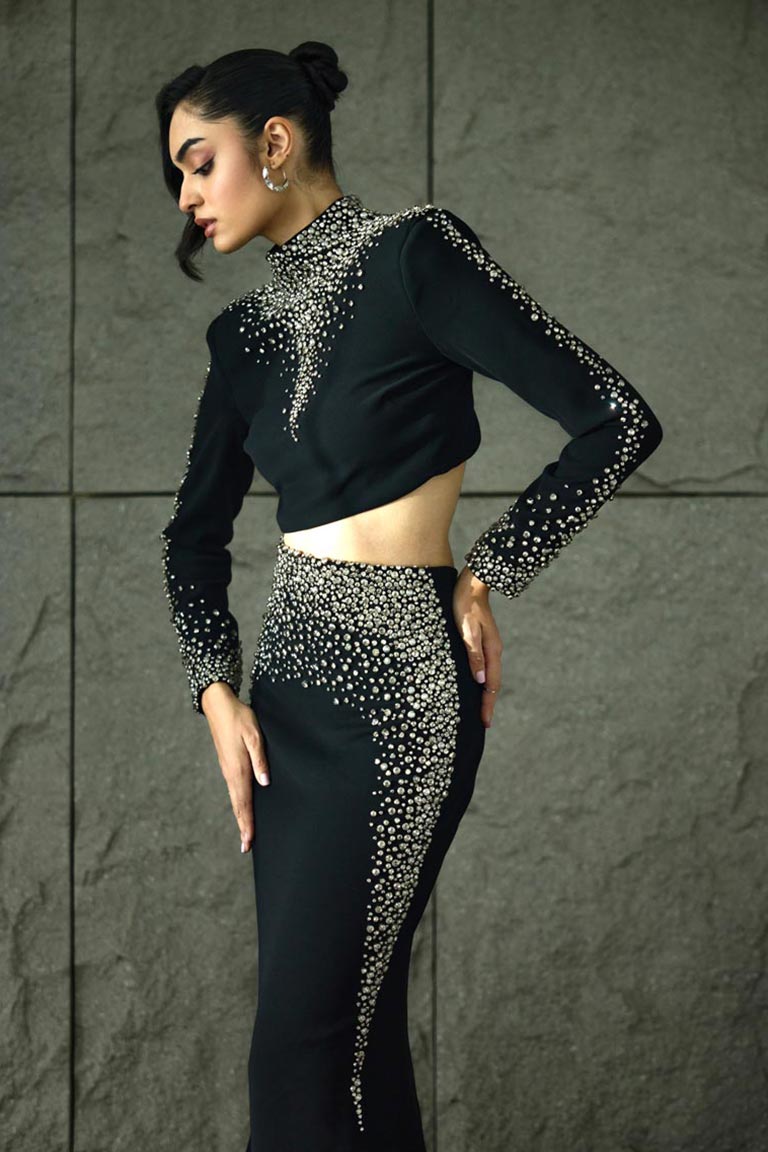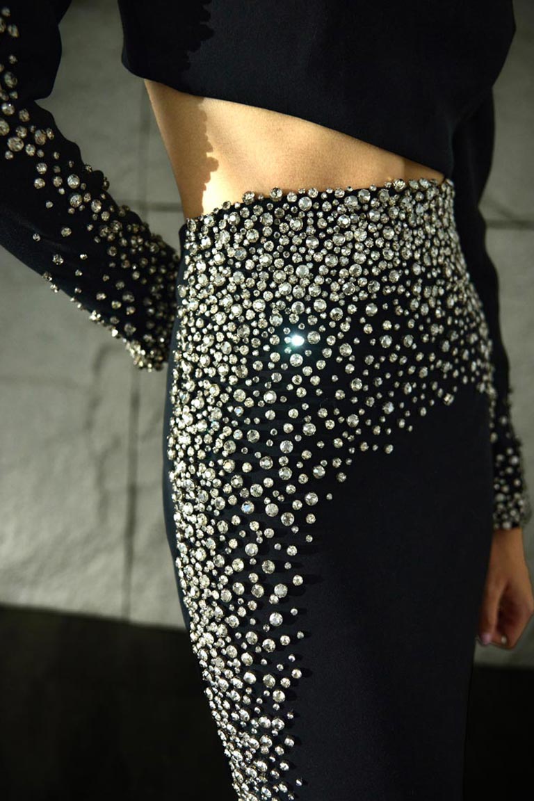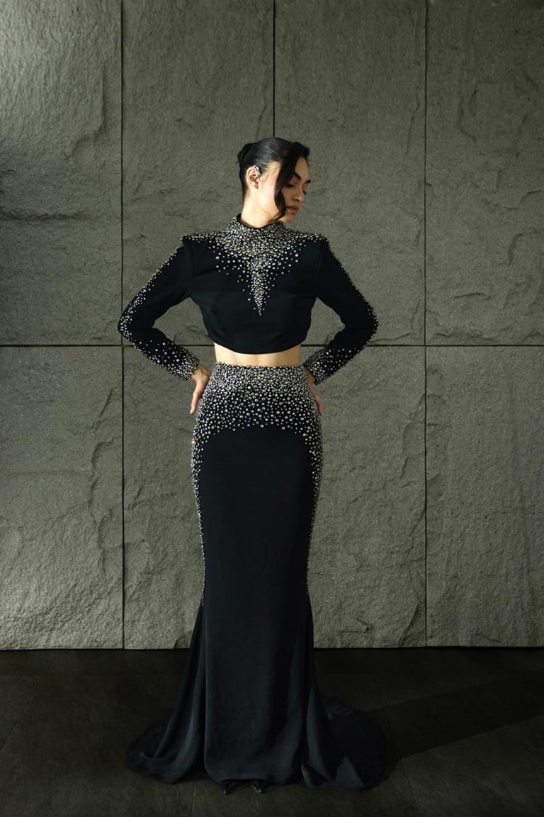Our Celeste Noir Set from the Right Before Midnight collection is a bold fusion of modern edge and celestial glamour. Crafted in deep black tones, this two-piece ensemble features intricate, stardust-inspired embellishments that create a dynamic silhoutte. The silhouette with its sleek, confident form, is the ultimate statement piece for a cocktail night and a glamourous celebration just before midnight.