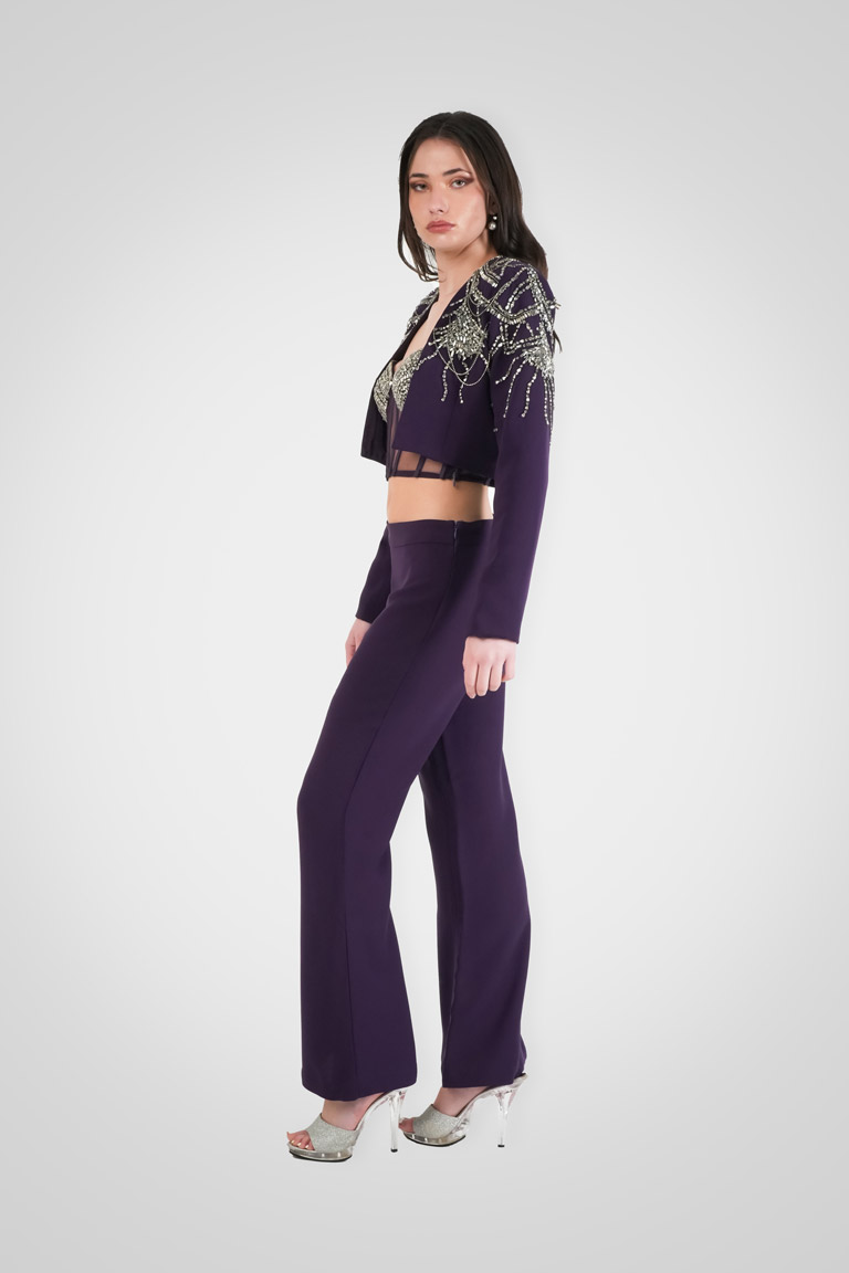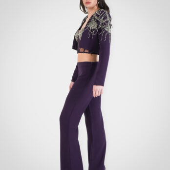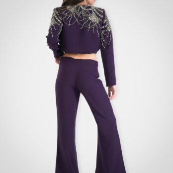 Our stunning “Heather” set, tailored in the finest crepe for your special occasions. This ensemble features a modernly tailored crop jacket adorned with exquisite glass beading on the shoulders and the corset inside. Paired with comfort-fit slightly flared trousers, it strikes the perfect balance of elegance and sophistication.
