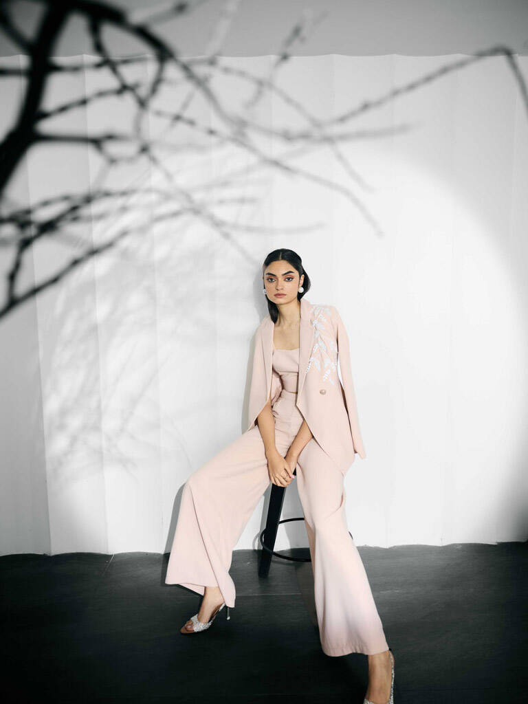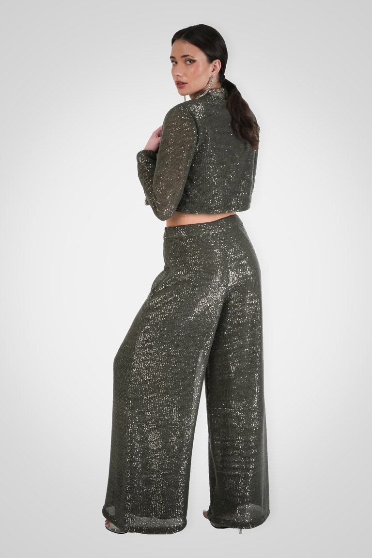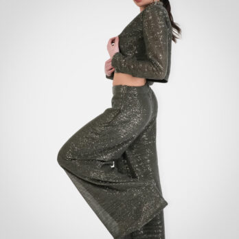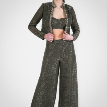 Our Seed Olive Laurel Set, a three-piece ensemble designed for elegance and versatility. Crafted from semi-sheer sequined fabric and fully lined for comfort, this set exudes sophistication. The bolero features a short, regular fit silhouette with a mandarin collar adorned with crystals, while the modernly tailored bustier offers multiple styling options. Complete the ensemble with the wide-legged sequined trousers for a look that blends comfort and style seamlessly.