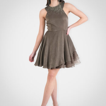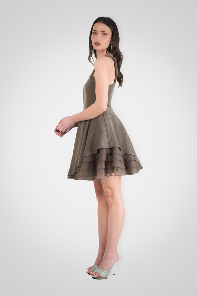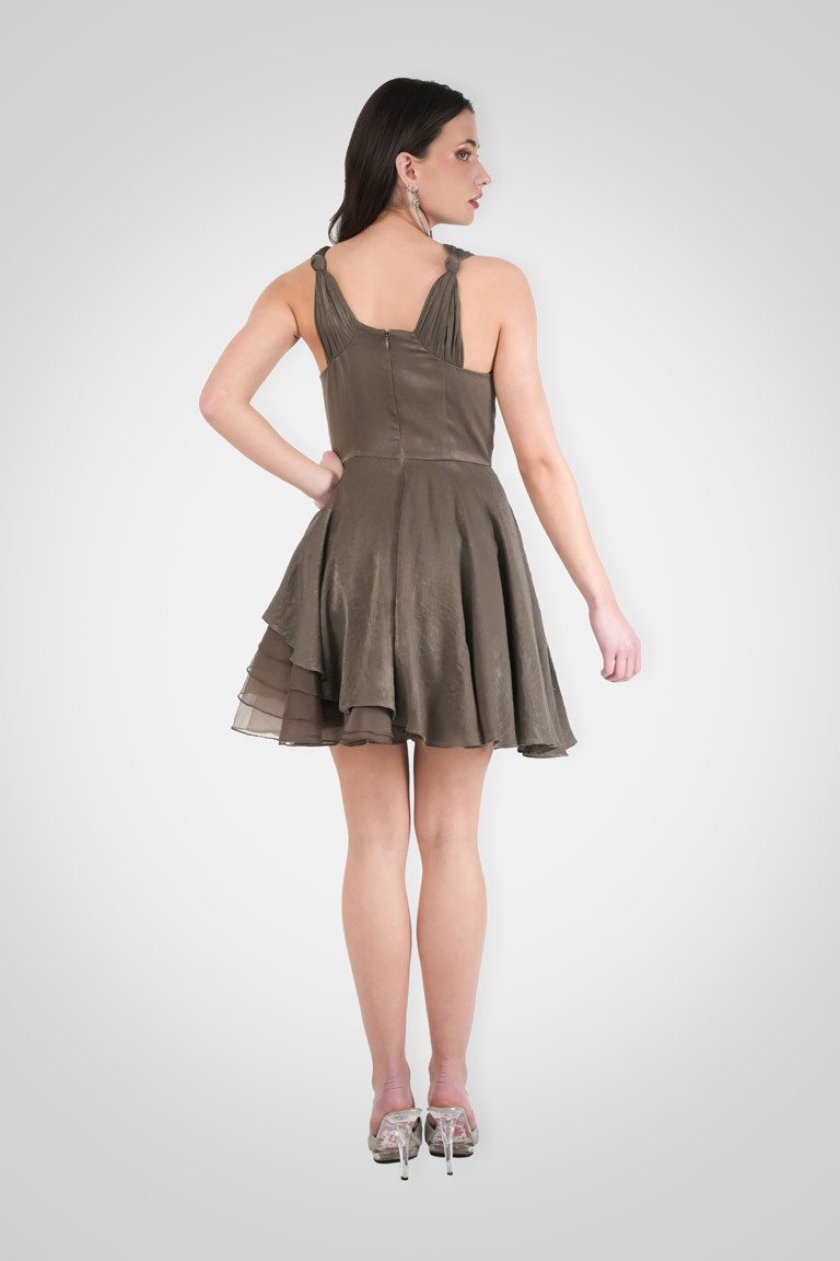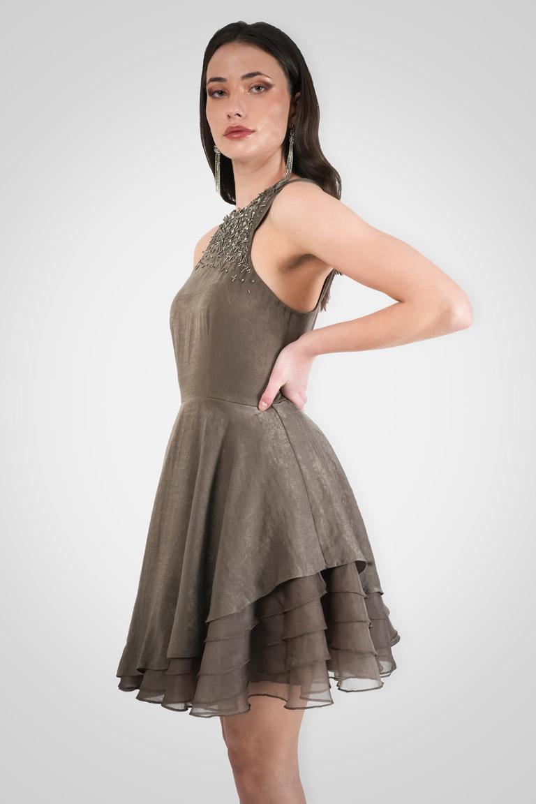 Our Mystique Skater Dress in Brunette hue—a playful blend of elegance and charm. Adorned with abstract bugle beads and scattered crystal embroidery it captivates with its unique silhouette. Organza ruffle layering on one side and ruched straps add an exclusive touch.