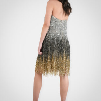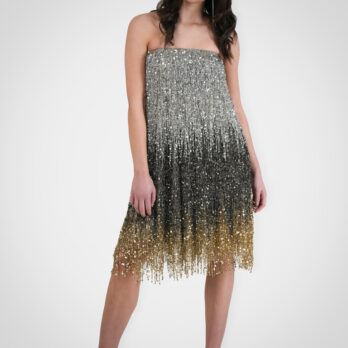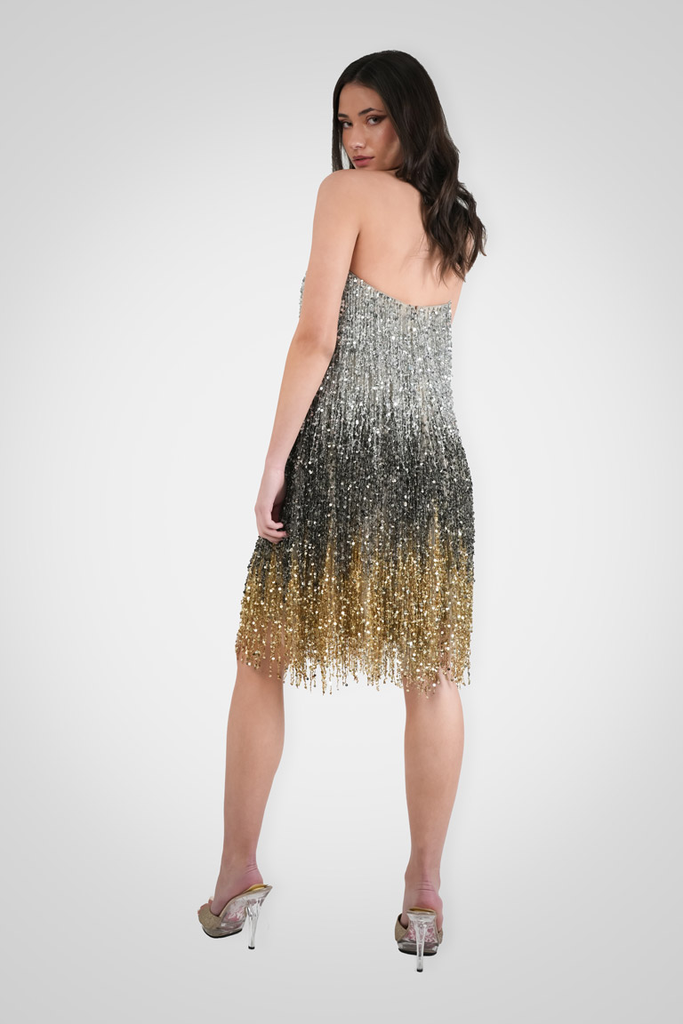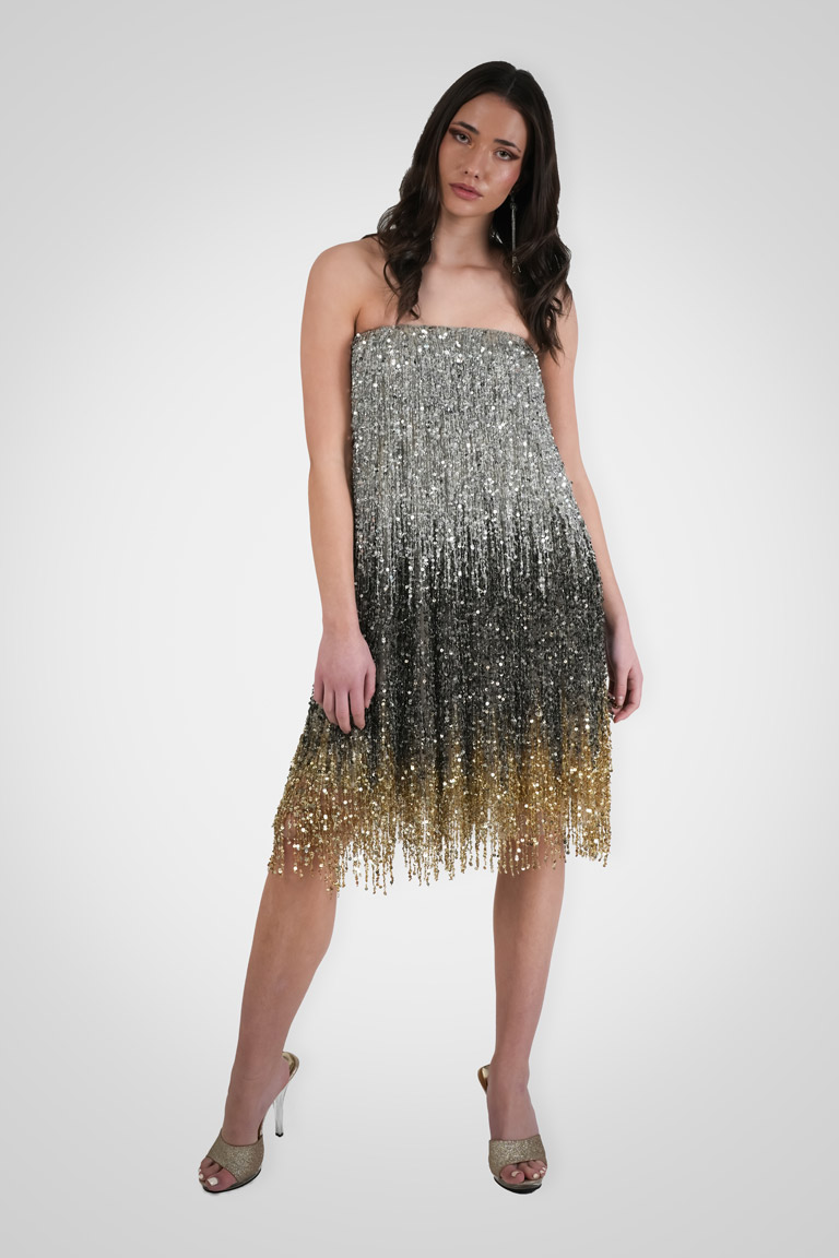 Our stunning ombre glit dress, crafted from tulle and adorned with hand-made fringes of sequins and glass beads. This exquisite piece showcases fine hand craftsmanship, capturing attention with its intricate detailing and elegant design.